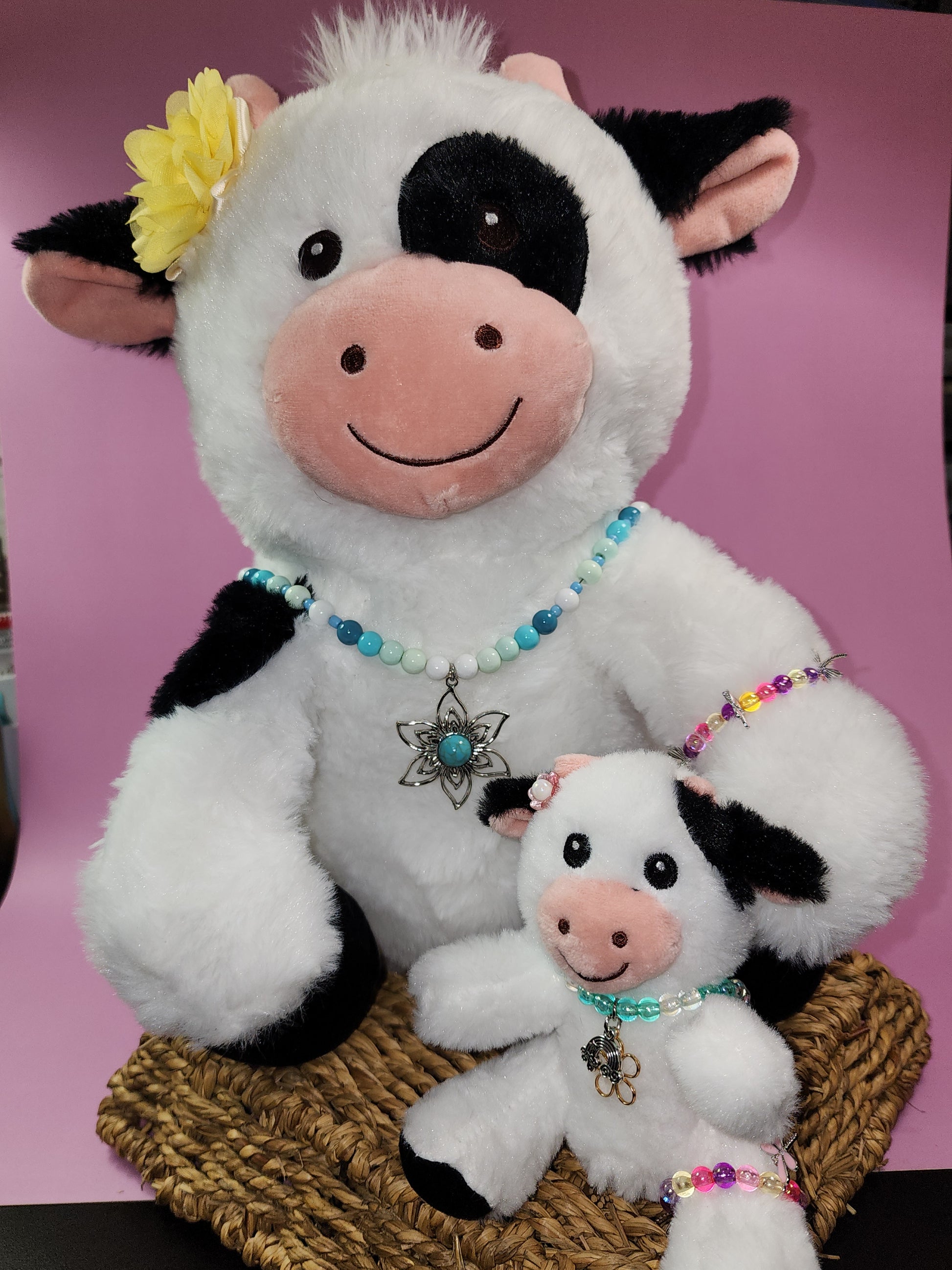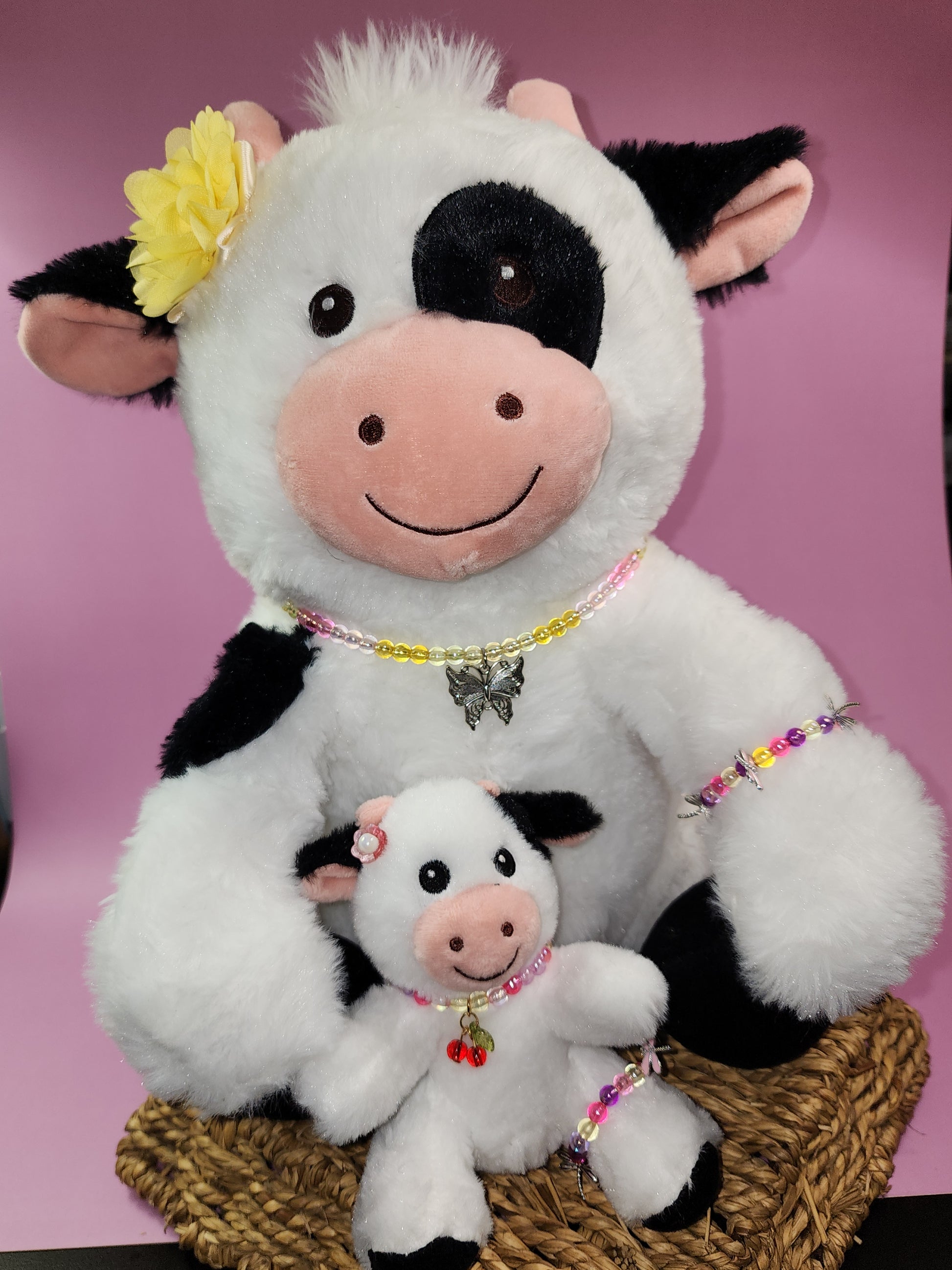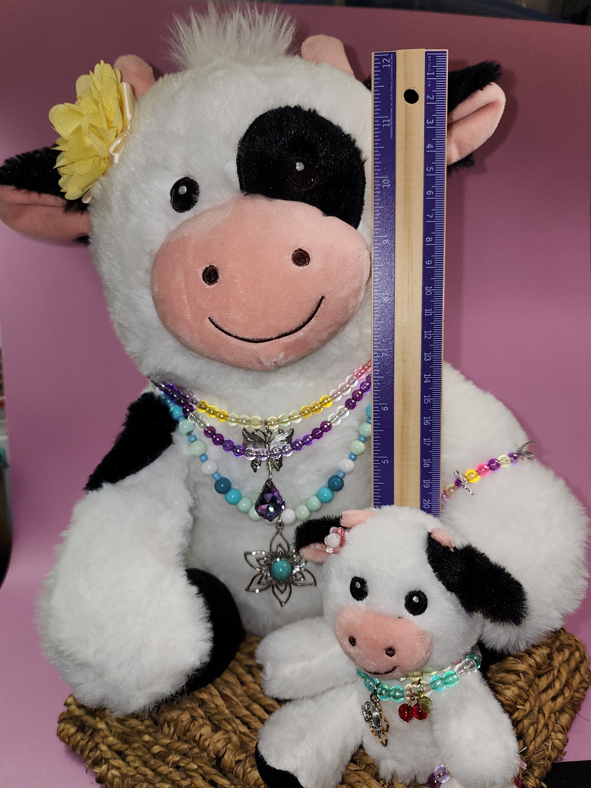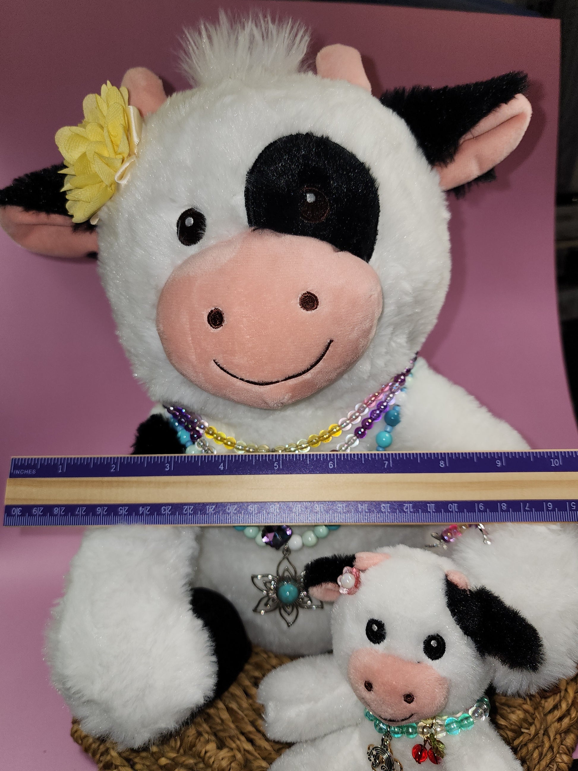 Mama cow sits 12+ inches tall comes with 3 interchangeable necklaces, 1 bracelet and non removable yellow flower adornments. Necklaces are held on with back lobster clasp.
